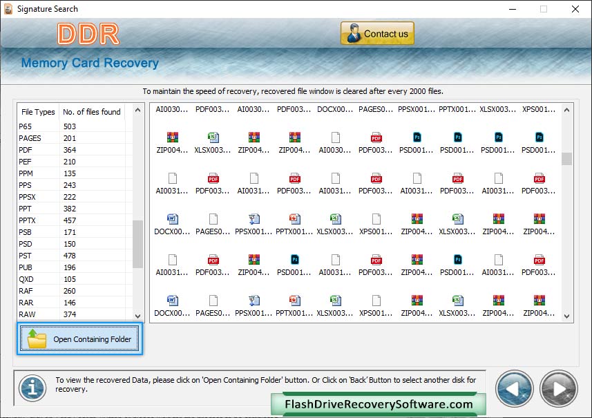 Home » Memory Card Recovery Software » Memory Card Recovery Software Screenshots Memory Card Recovery Software Screenshots To recovered data files, choose any one searching mode according to your requirement. Select the removable media from which you want to restore lost data and click Next button. Browse path where the recovered data will be saved and click Next button. Data recovery process is in progress. You can see the current status of recovery process. Click on Open Containing Folder to view recovered files.